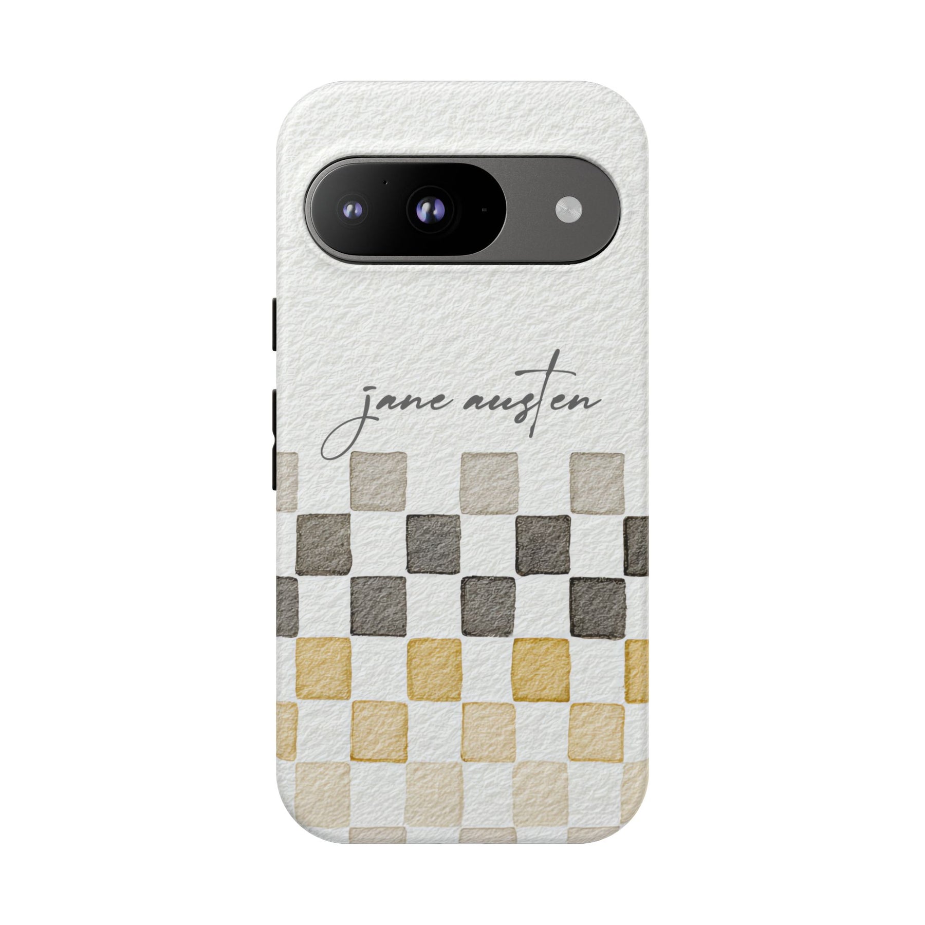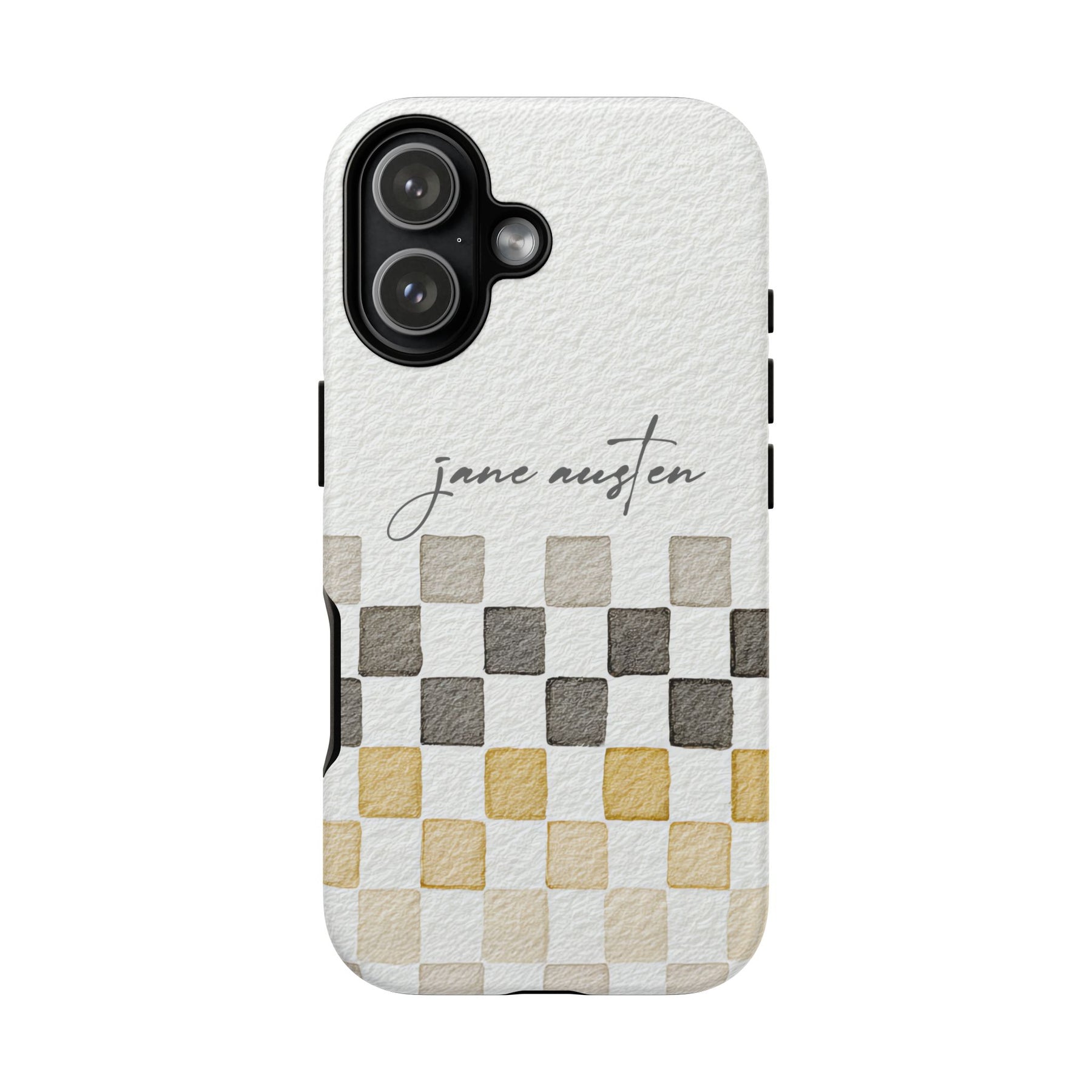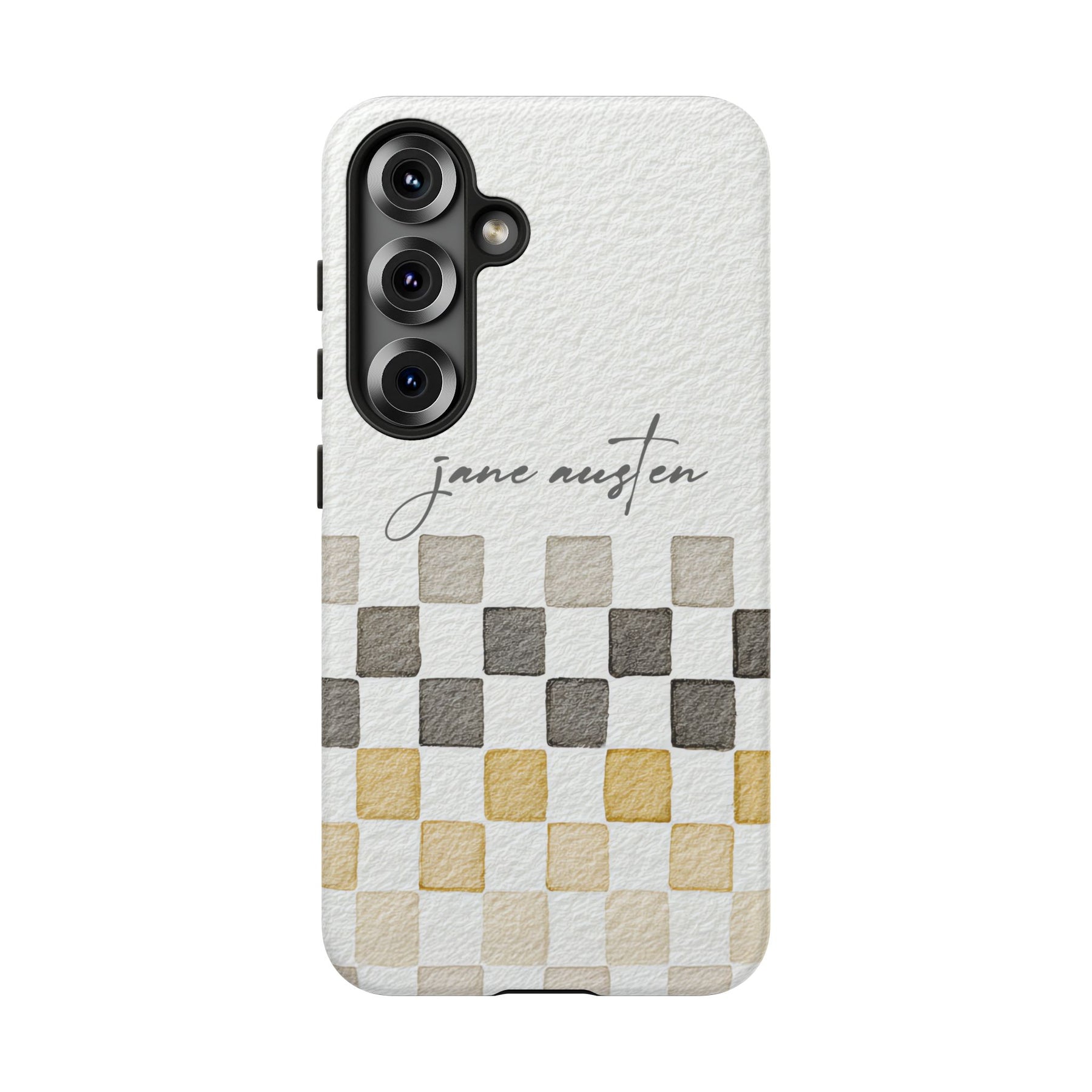 21Personalized phone case with a clean minimalist checked design in grey and beige, allowing the buyer to personalize with their name, monogram, and bible scripture. Provides excellent protection against drops and tears, making it perfect for adults looking for a durable and customizable phone case. Ideal for gifting on birthdays, anniversaries, and holidays.