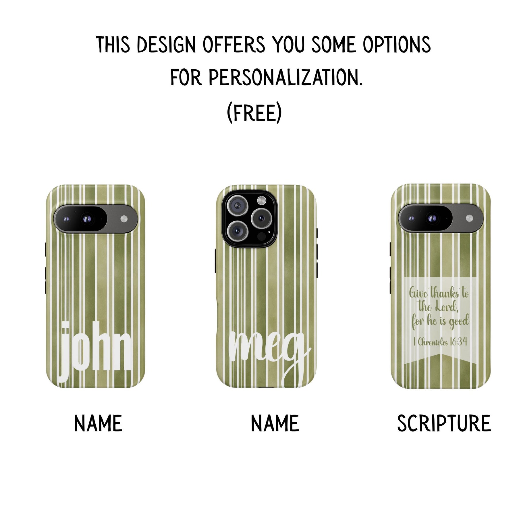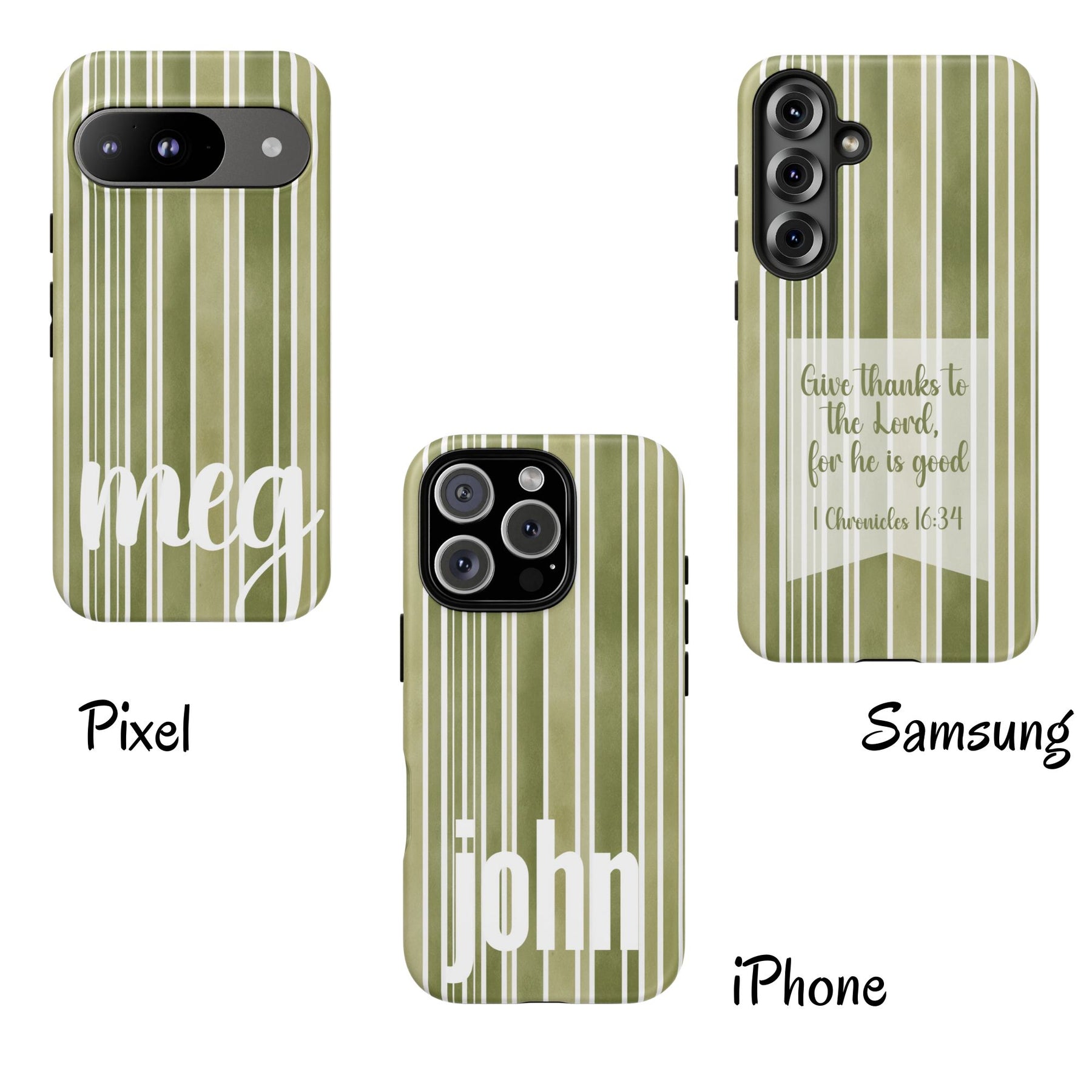 A trendy and modern tough case phone for iPhone, Samsung, or Pixel with a green stripe design customizable with a name or Bible scripture. Provides excellent protection against drops and tears, making it perfect for adults looking to keep their phones safe and stylish. Ideal for gifting on birthdays, holidays, or as a special occasion present.